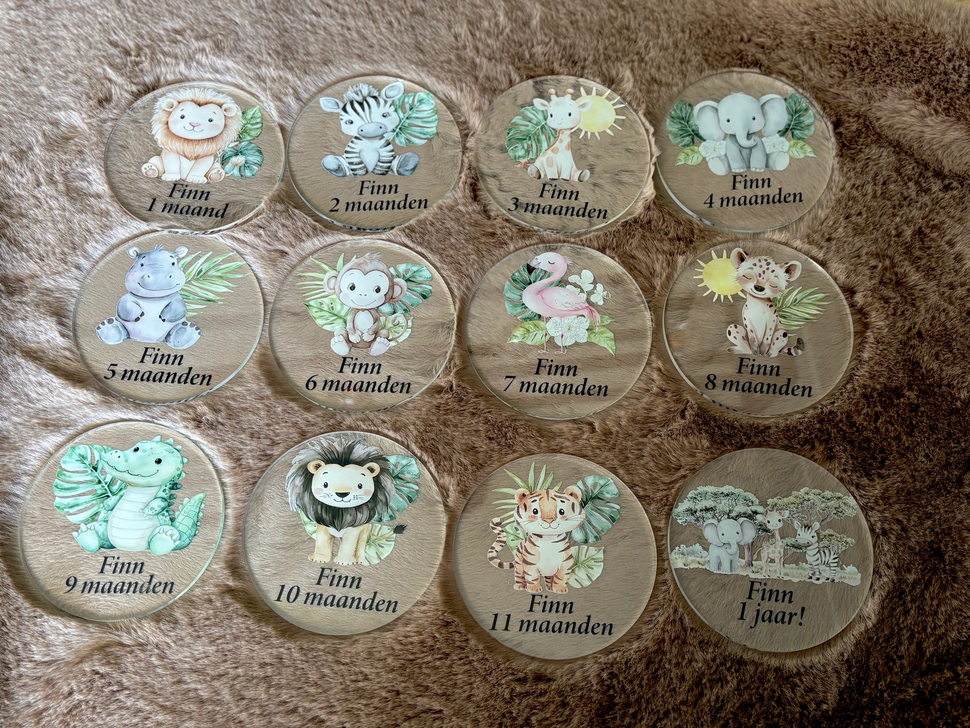 Deze set van 12 unieke, transparante plexiglazen schijven van 10 cm diameter is de perfecte manier om de groei van je baby vast te leggen. Elke schijf is voorzien van een lieve jungle-dier illustratie, de naam van je kindje (aanpasbaar!) en de leeftijd in maanden.